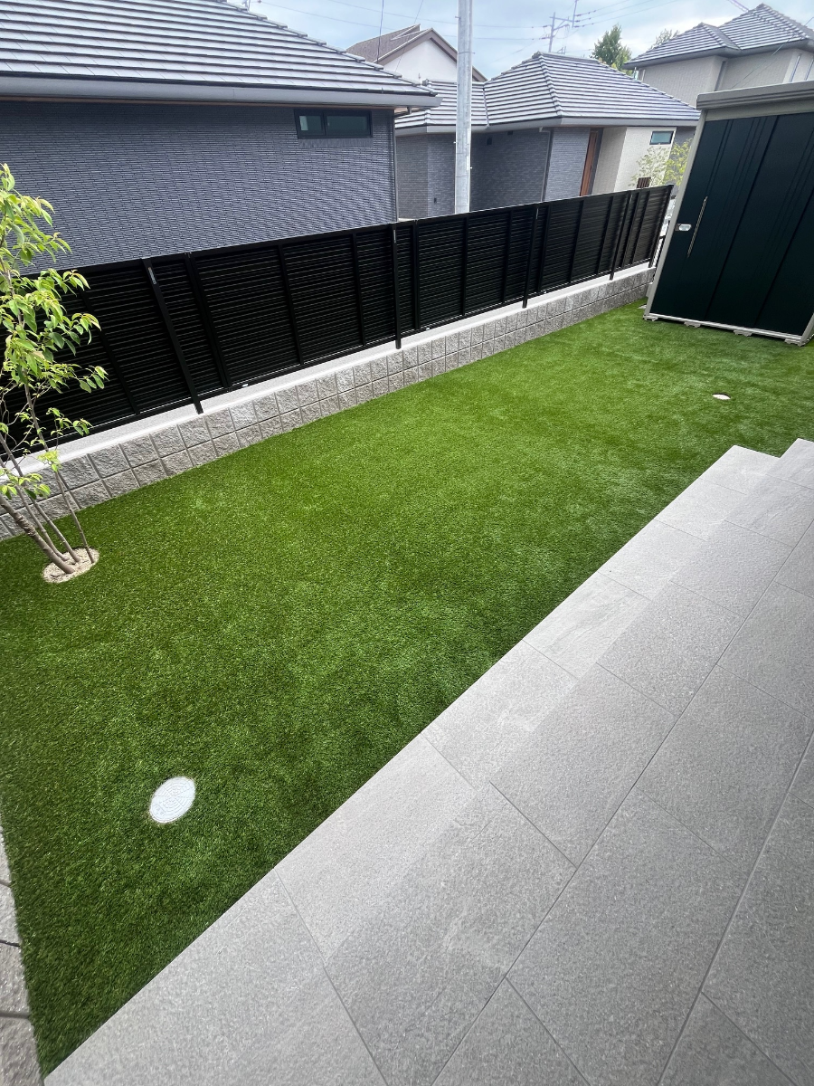 今回は新築のお庭に人工芝を施工し、見た目も美しい安全性とメンテナンス性、どちらも兼ねたお庭を実現致しました。