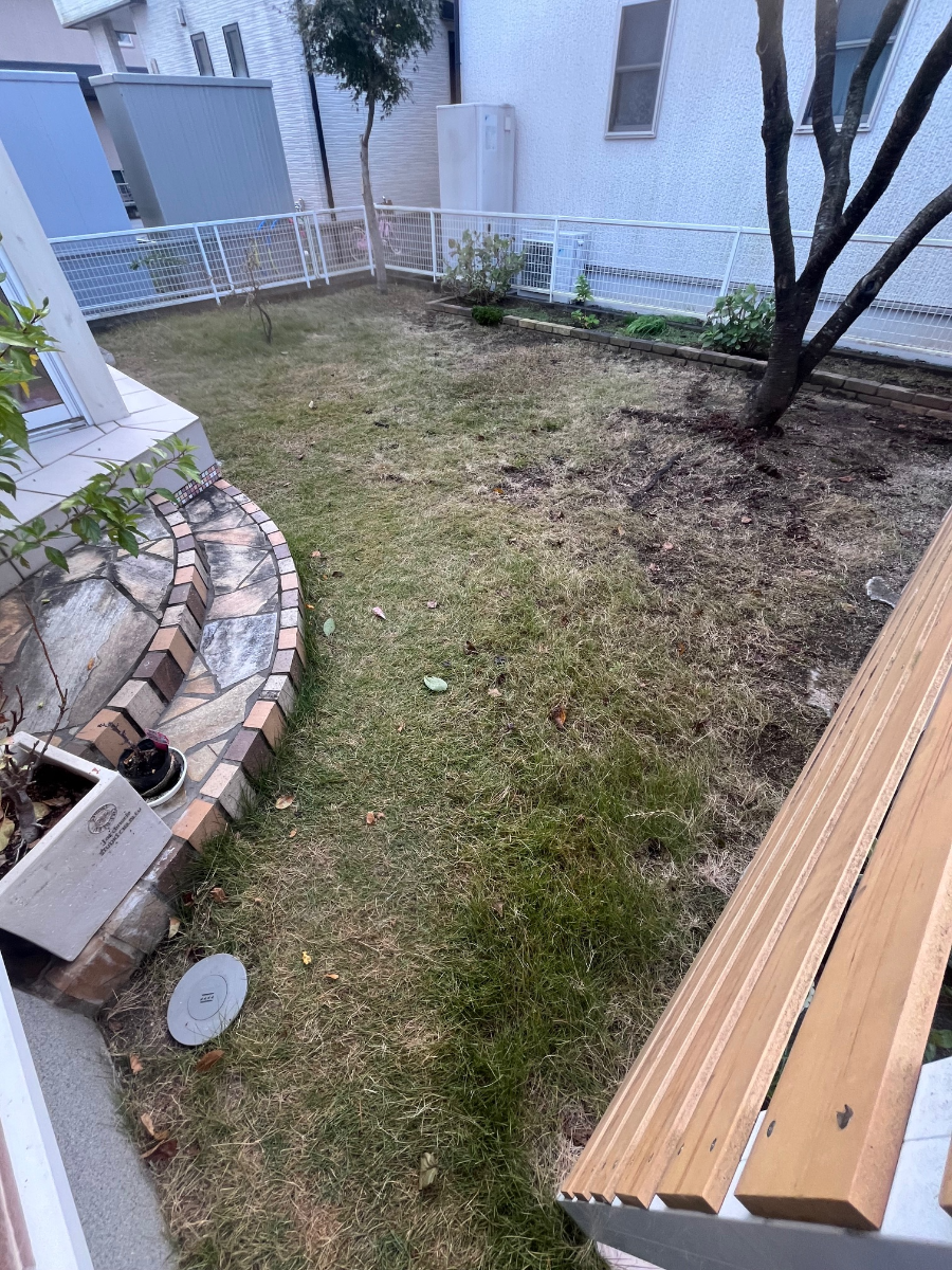 今回は天然芝のお庭をスッキリ一面人工芝へリフォーム致しました。
