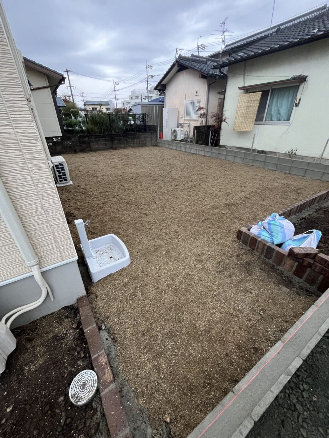 山砂を追加しながら不陸調整、プレート転圧、整地。防草シート施工にて雑草対策も!!