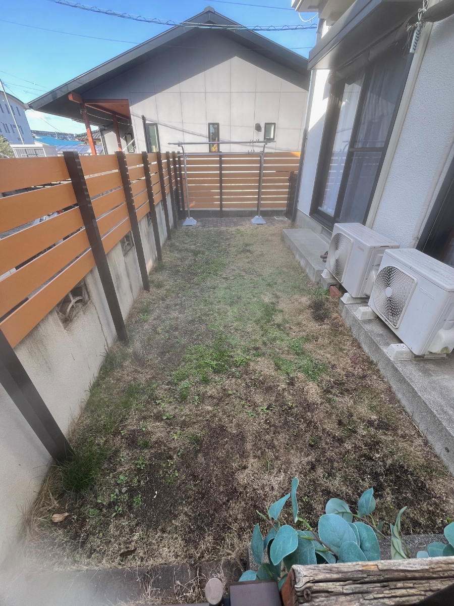 施工前のお写真になります。天然芝の管理がとにかく大変というお悩みが御座いました。今回は明るいグリーン色&高クッション性能でフカフカのデラックス芝丈28mmを使用。メンテンスフリーな快適空間をお届けいたします♪