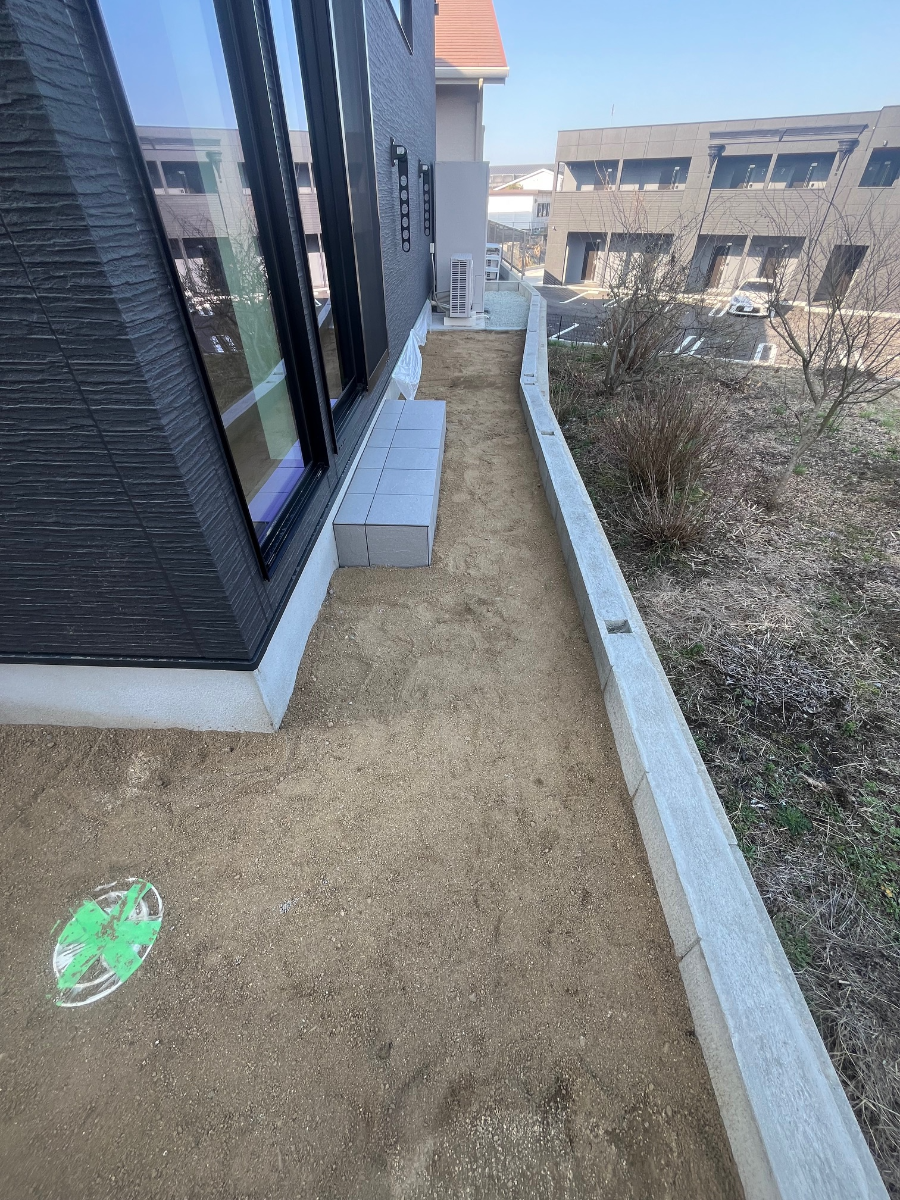 施工前のお写真になります。新築のお庭に雑草抑制&景観UPの為、人工芝の導入をご検討されたようです。今回はコスパ№,1のスマイルグリーンAタイプ芝丈30mmを使用。景観UPした素敵な緑空間を御提供致します♪